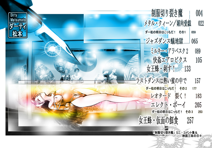画像紹介 「制服切り裂き魔」 その2 「メタル・クィーン/媚肉愛戯」 その2 「ジャズダンス蟻地獄」 「ラストダンスは熱い蜜の中で」 「レオタード 裂く!」 「エレクト・ボーイ」前後篇/ 他にも作品も数本在り→目次